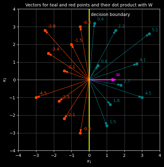 ax.set_title(r"Vectors for teal and red points and their dot product with W", fontsize="10")