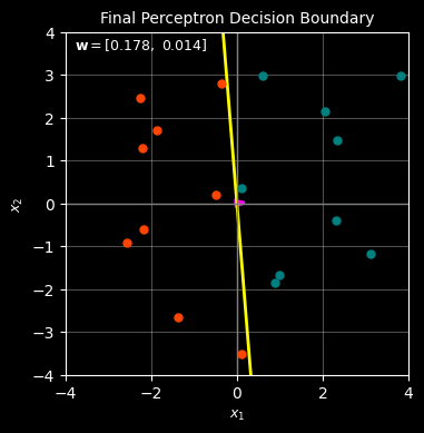 The perceptron algorithm is a classic approach to finding a decision boundary on a set of points that are linearly separable. It works by starting with a weights vector and initiatlising it to [0,0], working out the dot products and scoring how many classificaitons it got incorrect. It then makes a change to the Weights vector and tries again. It keeps going until it successfully find a W that works and the decisoin boundary is then perpendicular to that W vector.Note that it may not choose the BEST solutoin, but if the points can be separated it is guaranteed to work.
